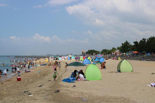 豊かな緑に囲まれ、白い砂浜に青い海が広がる海水浴場。