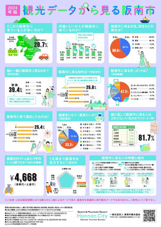 (一社)阪南市観光協会は、2021年10月から実施している阪南市来訪者対象のWebアンケートと対面調査により取得したデータ及び分析結果の一部を「2024年版 観光データから見る阪南市」として公開します。